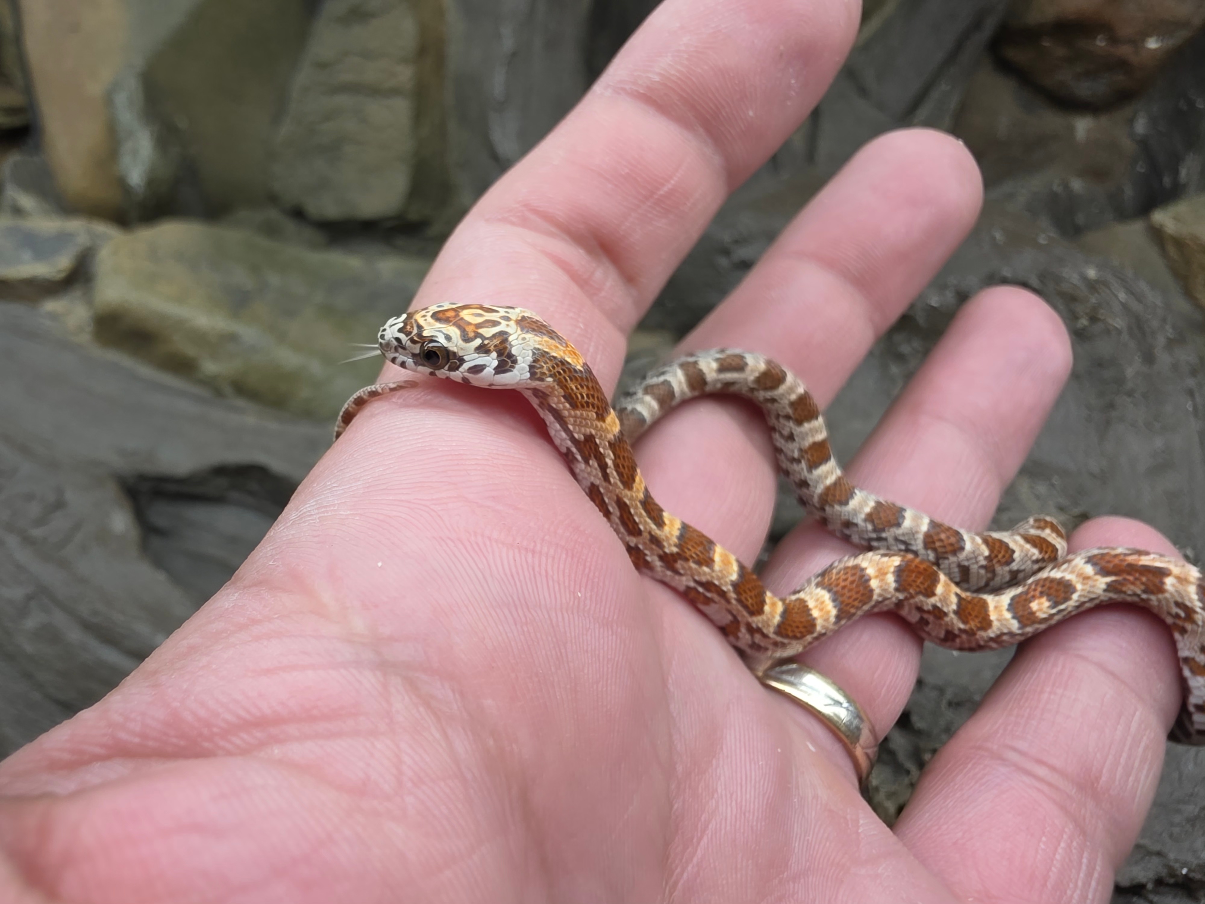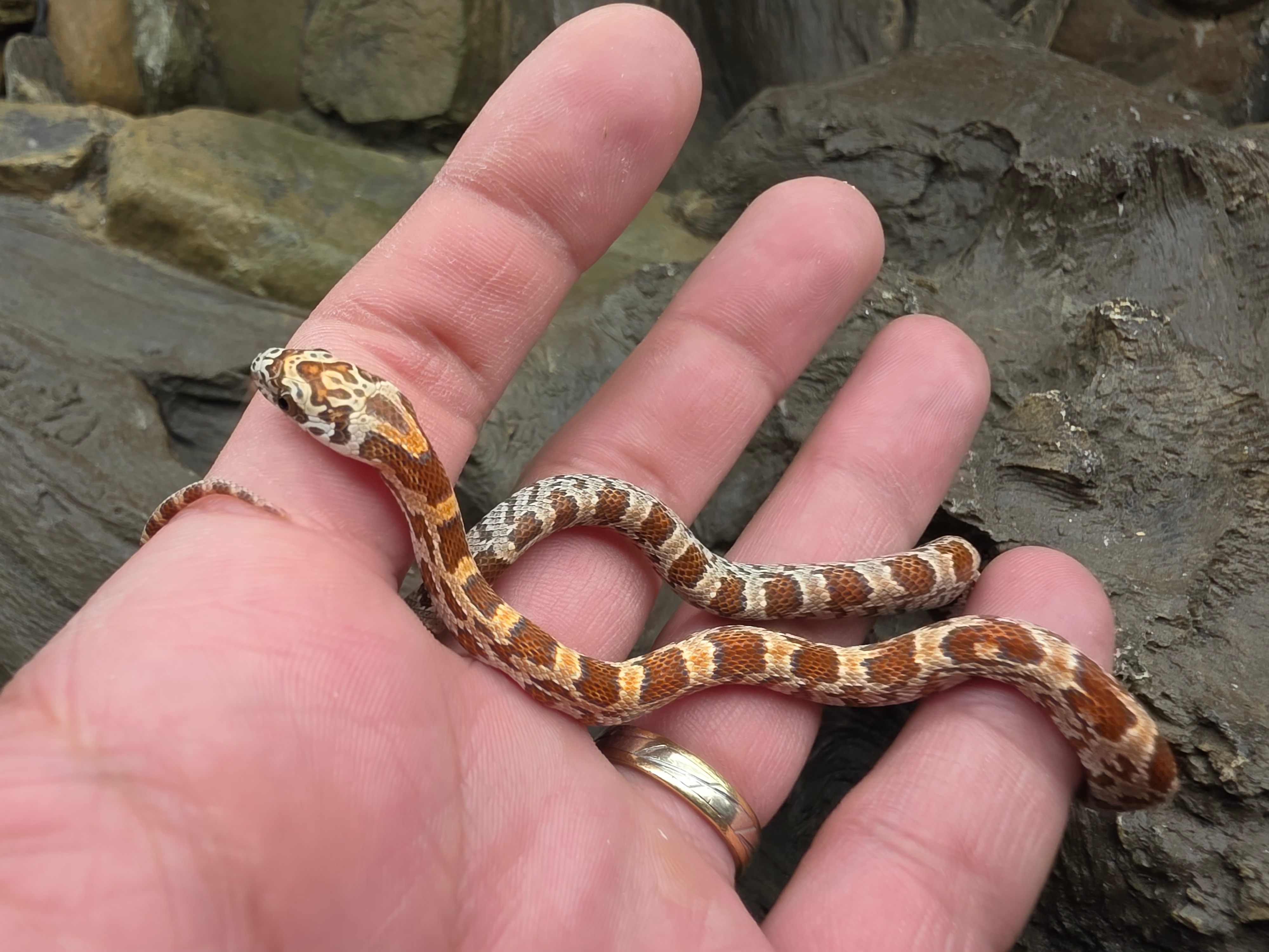 Pantherophis guttatus sp scaleless, jeune femelle née en 2025 "Hypo sunkissed 100% het.caramel 66% het.anery 50% het.scaleless motley 33% het.albinos" Nom : KIMA