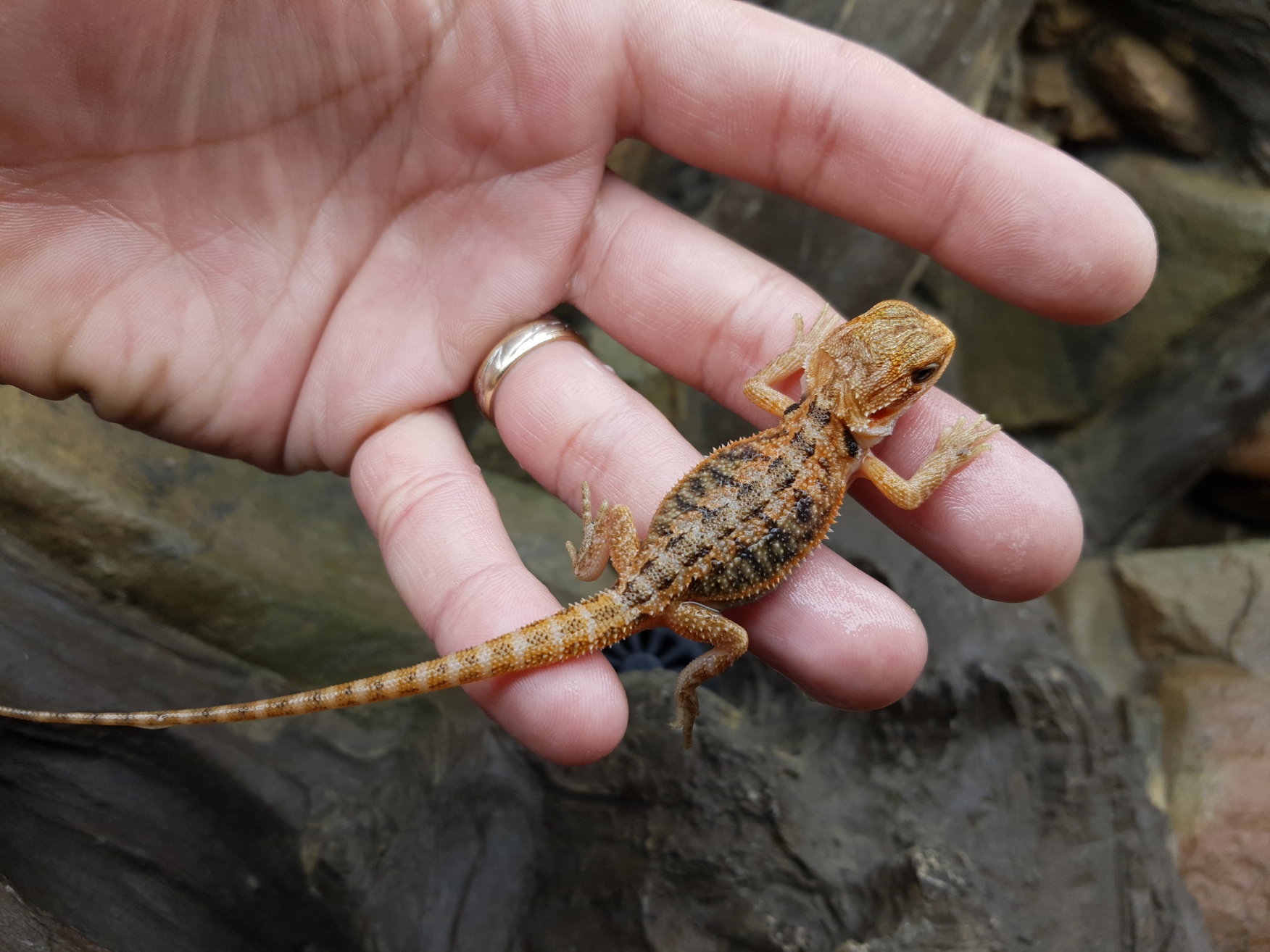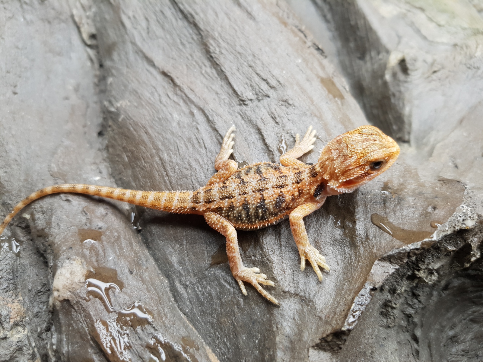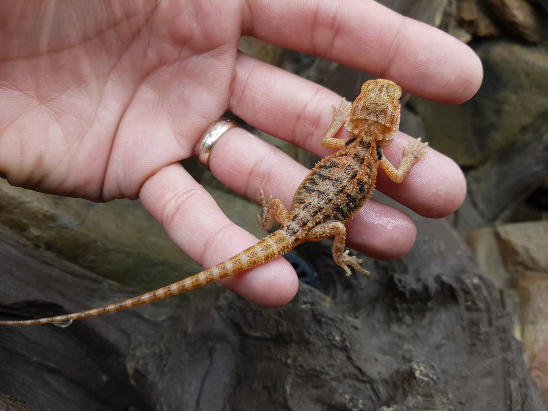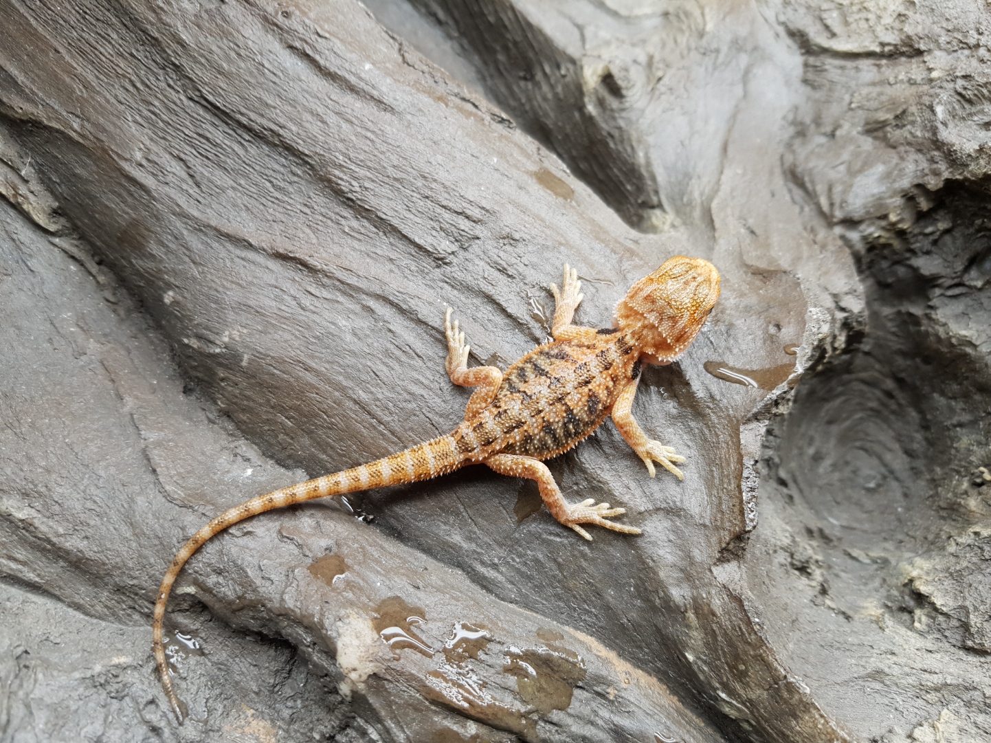 Il n’a pas besoin de beaucoup d’eau mais il est toujours plus convenable de lui fournir un récipient à disposition en captivité (dans la nature, c’est un moyen de survie car il vie dans les déserts australiens là où les journées sont très chaudes et les nuits très froides et où l’eau n’est pas en abondance).